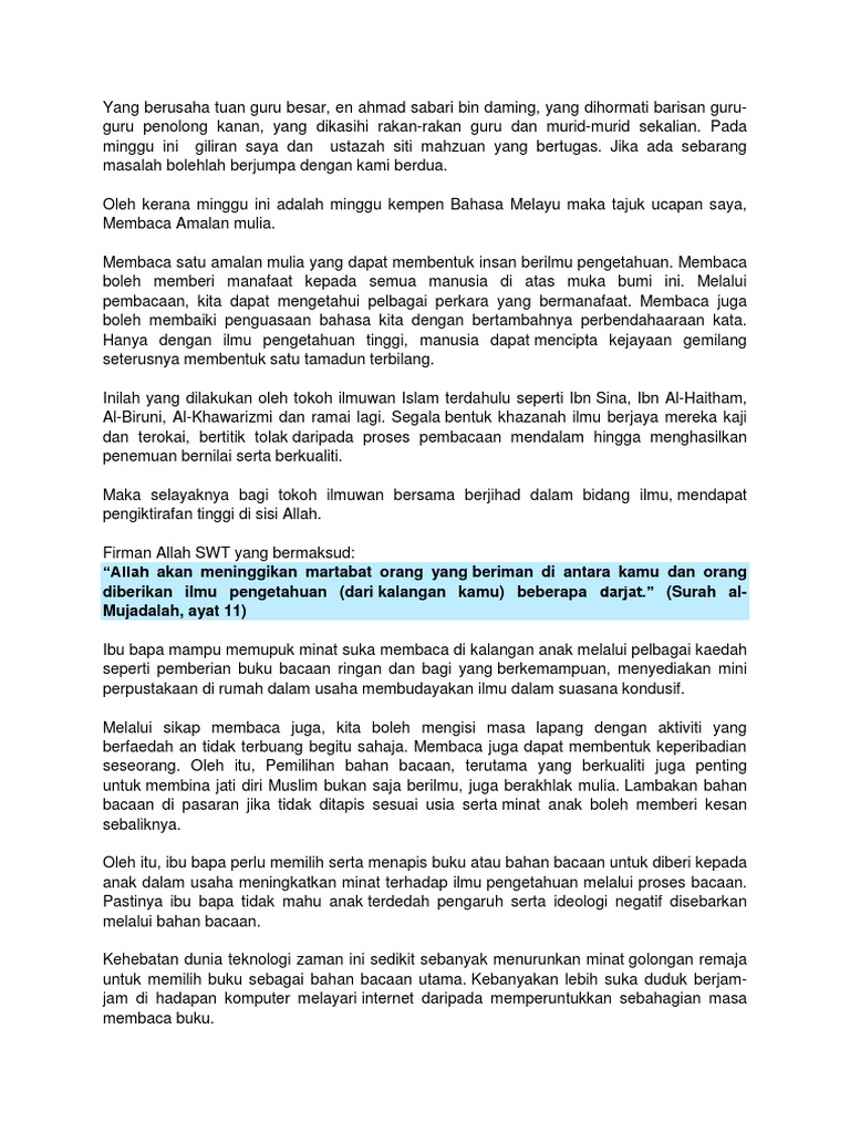 Yang Dihormati Tuan Pengerusi Majlis Yang berusaha Tuan Guru Besar guru-guru penolong kanan guru-guru dan rakan-rakan sekalian. Melalui pembacaan kita dapat mengetahui pelbagai perkara. B saya meletakkan buku itu diatas meja.